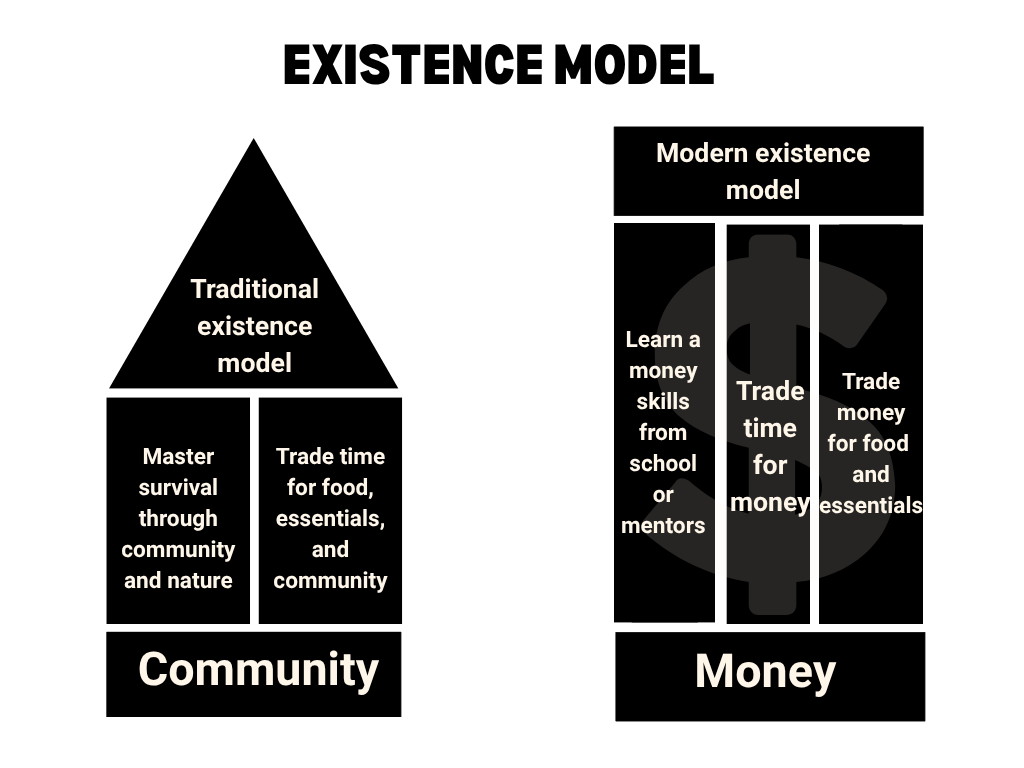 The modern existence model is built around money - you go to school, learn money-making skills, work for money, and use it to survive. Without money, life stops.